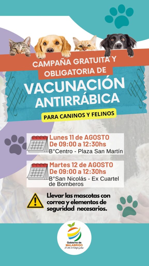 El Gobierno de Malabrigo informa a la comunidad que se llevará a cabo una nueva Campaña Gratuita y Obligatoria de Vacunación Antirrábica destinada a perros y gatos de la ciudad.
