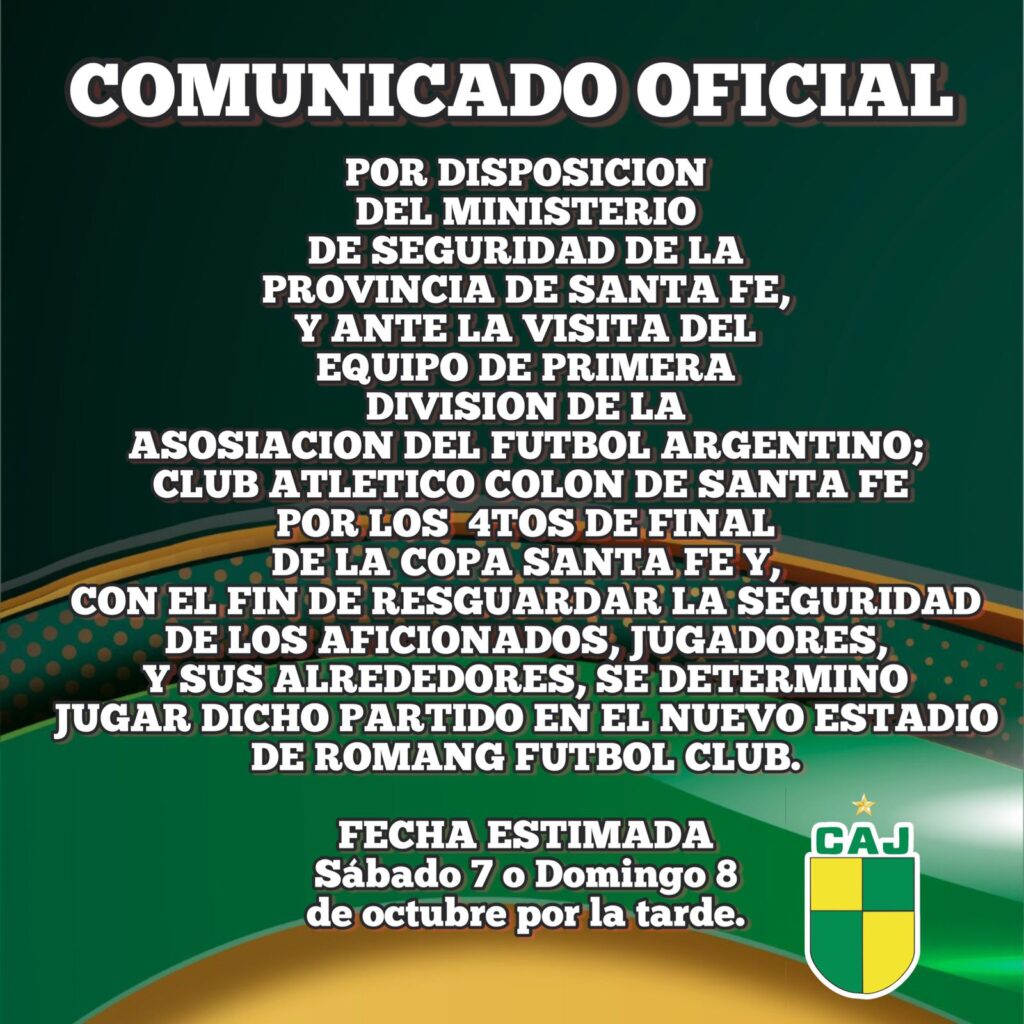 Por medida de seguridad y con la prioridad de garantizar la seguridad de los aficionados y jugadores, el Ministerio de Seguridad de la provincia ha decidido que el esperado enfrentamiento de cuartos de final de la Copa Santa Fe entre Juventud de Malabrigo y Colón se llevará a cabo en el flamante estadio de Romang FC.