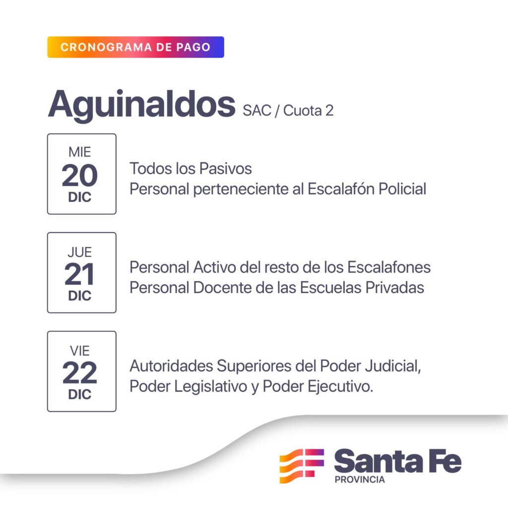 El miércoles 20 se dará inicio al pago del aguinaldo para los agentes provinciales. En primer turno cobrarán todos los pasivos y el personal perteneciente al escalafón policial. El jueves 21 será el turno del personal activo del resto de los escalafones y el personal docente de las escuelas privadas. Finalmente, el viernes 22 cobrarán las autoridades superiores del Poder Judicial, Poder Legislativo y Poder Ejecutivo.