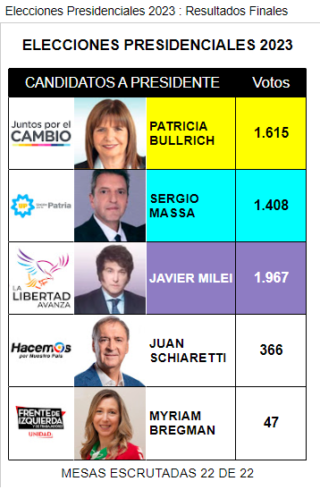 ELECCCIONES EN MALABRIGO: TRIUNFO DE MILEI,SEGUNDA BULLRICH, TERCERO MASSA.