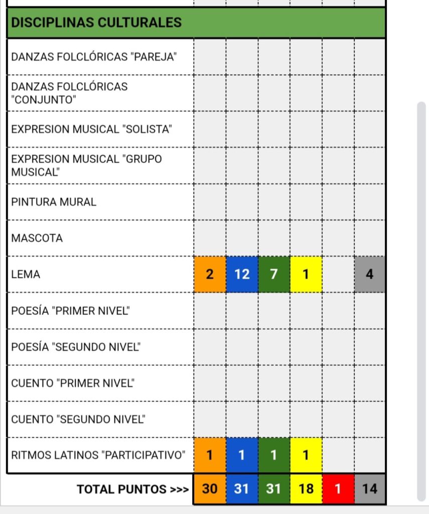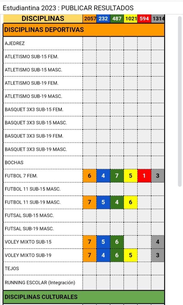 Hoy martes 19 se llevo a cabo el Voley en el gimnasio del Club Juventud y los puntajes obtenidos por los establecimientos educativos hasta hoy son los siguientes :