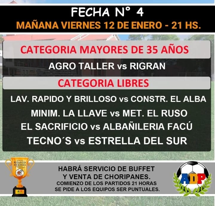 Después de un breve paréntesis debido a las condiciones climáticas adversas que afectaron la región, hoy viernes, la emoción vuelve a ADP con el reinicio de la fecha número 4 en la liga local de fútbol. Los amantes del deporte y la comunidad en general están invitados a sumarse y disfrutar de una noche llena de acción futbolística, convivencia y diversión.