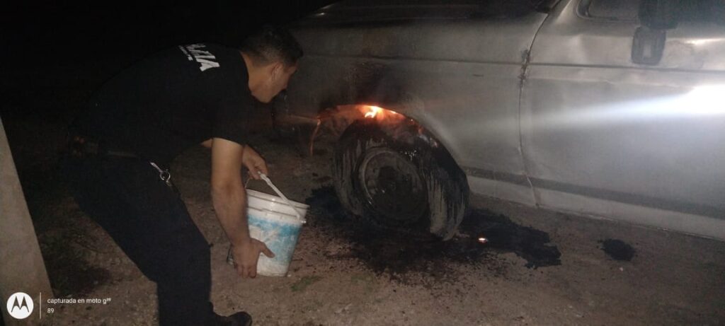 Una camioneta Ford F100, estacionada en el lugar, presentaba un incendio en su rueda delantera izquierda, del lado del conductor. El equipo policial actuó de manera inmediata, desplegando los protocolos necesarios para sofocar las llamas y evitar una propagación que pudiera poner en peligro a personas y propiedades cercanas.